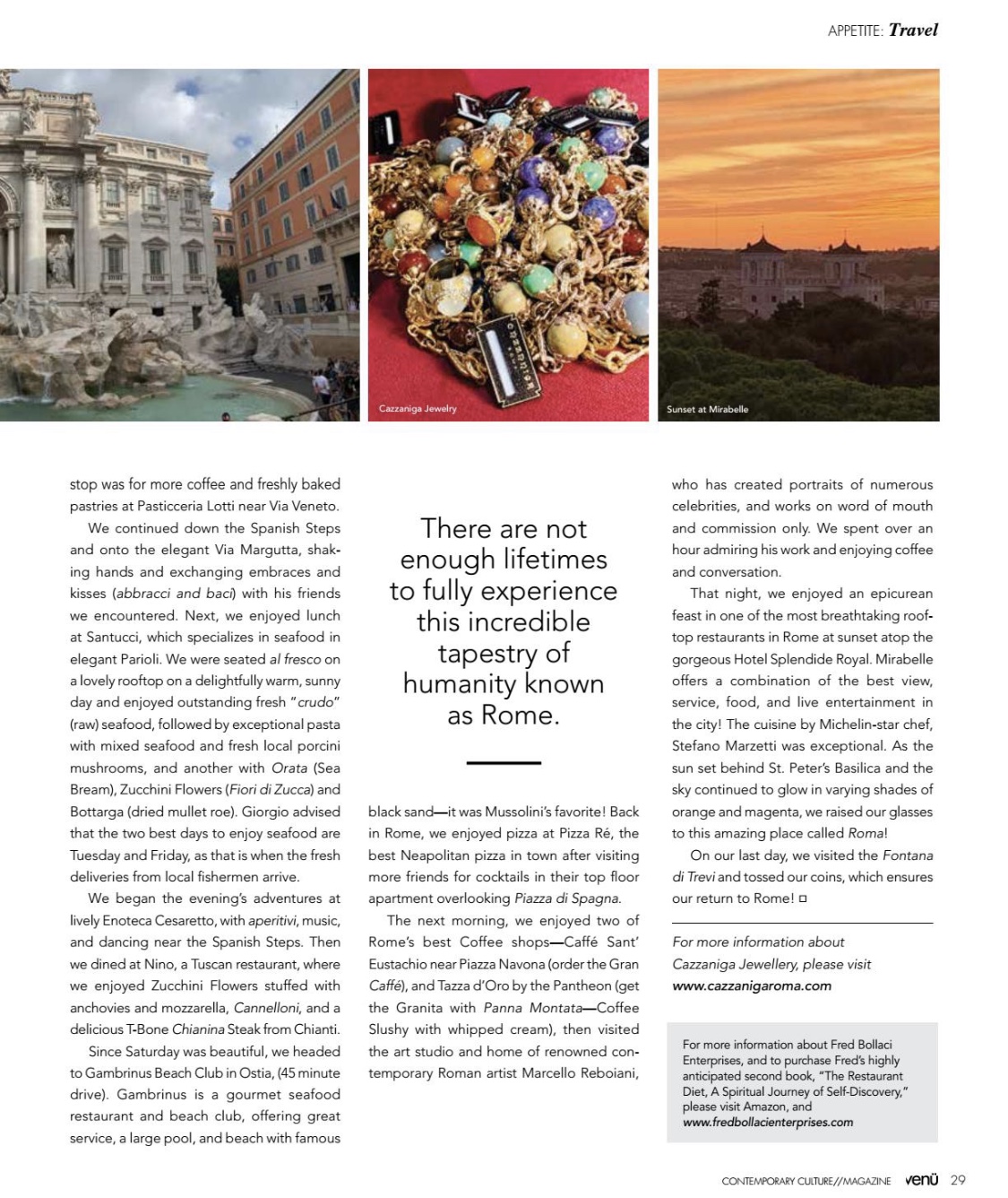 Fred Bollaci’s “Jewels of Rome” Article in Venu Magazine Explores the Best Restaurants, Hotels, and More in this Exclusive Behind the Scenes Tour with Giorgio Cazzaniga, “The Unofficial Mayor of Rome”! We look forward to bringing more exciting travel content soon and look forward to the day when travel will be safe and practical. In the meantime, stay safe and healthy everyone!