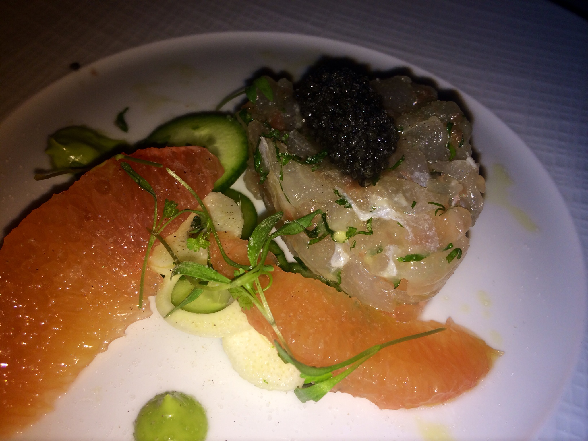 Wild Striped Bass Carpaccio with pink grapefruit segments, light and perfect for summer!