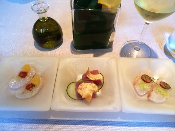 For starters, Marea is an absolutely exquisite environment.  Backlit golden onyx walls, gleaming wide-planked wooden floors, red Italian lamps, crisp white table linens and large soundproof windows looking out onto the rest of the world from the oasis that is home to one of the best dining experiences this world traveler has had— it calls to mind dinners at Italian “pescheria” heaven, notably Rome’s famed La Rosetta, the platinum standard for seafood in Italy, and one of the best seafood restaurants in the world, and neighboring Quinzi e Gabrieli, another outstanding establishment, which showcases the epitome of fresh and innovative.  Both within blocks of each other and of Rome’s famed Pantheon, go to either (preferably both when in Rome) and stroll for gelato after (try Giolitti).