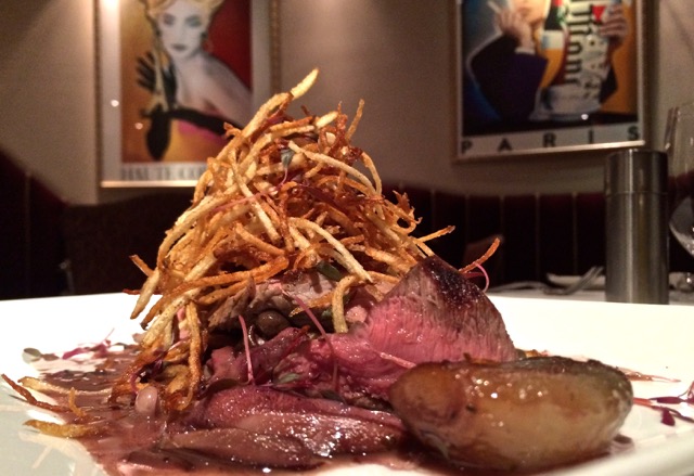 Divide the mushrooms in the center of 6 plates. Arrange the shallots and tomatoes around the mushrooms and place the sliced steak on top of the mushrooms. Top with potato allumettes and serve!