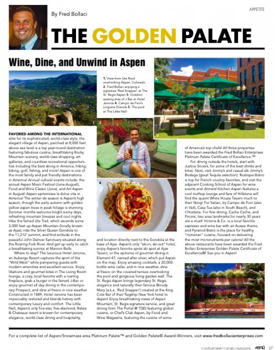Read about three new Platinum Palate award-winning hotels, The Little Nell, Hotel Jerome, and The St. Regis Aspen, as well as many excellent restaurants, all Golden Palate award winners!