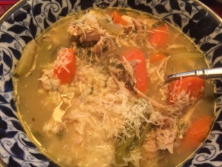Sauté the vegetables and onion until translucent, add the bay leaf and chicken, sauté several additional minutes, add water/stock/bay leaf, simmer on low-medium heat about an hour, skim the top, add chopped Italian parsley, cook the pasta until al dente separately add approximately 2 ounces of pasta to each bowl, add broth, chicken, and vegetables, top with freshly grated parmigiano reggiano.
